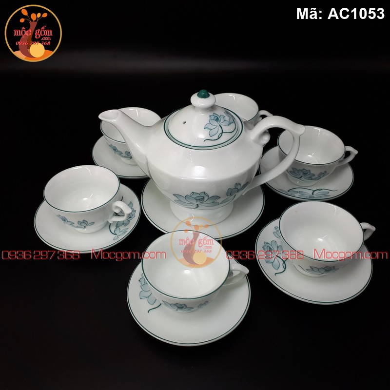 Bộ ấm chén AC1053 vẽ sen xanh trang nhã, gốm Bát Tràng cao cấp, mang hơi thở thiên nhiên, tạo cảm giác thư thái trong từng tách trà.